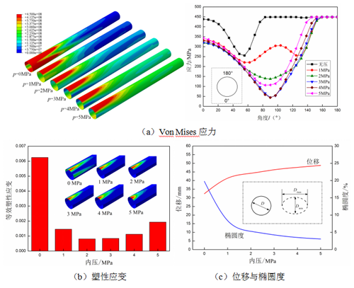 圖3(b)中,隨著內壓增大,管道最大等效塑性應變先減小后增大,無壓管道的塑性應變最大,塑性變形區(qū)主要出現(xiàn)在管道頂部,管道下半部分未發(fā)生塑性變形,無壓管道的兩側也發(fā)生了塑性變形。隨著內壓的增大,橢圓形塑性區(qū)的長半軸逐漸減小,而短半軸則逐漸增大。