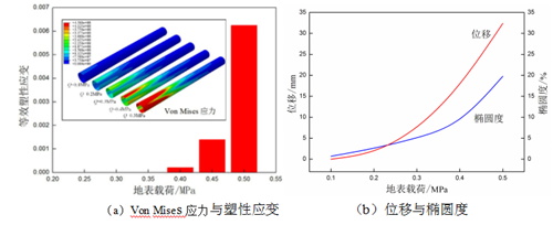 圖4(b)中,隨著地表載荷增大,管道沉降量逐漸增大。當地表載荷小于0.2 MPa時,管道最大沉降量僅為1.3 mm。管道最危險截面橢圓度隨著地表載荷的增大而增大,當地表載荷小于0.4 MPa時,管道僅發(fā)生彈性變形,且橢圓度變化率非常小。當進入非彈性階段后,管道橢圓度較大且出現(xiàn)塑性變形。此時,管道承載能力急劇降低,不利于清管工作,且易出現(xiàn)裂紋[7]。