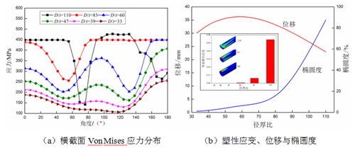 圖5(b)中,當徑厚比為60時,管道未出現(xiàn)塑性變形。隨著徑厚比增大,管道的塑性應變和塑性變形區(qū)域均增大。塑性變形區(qū)最先出現(xiàn)在管道頂部,隨著徑厚比增大,管道兩側也逐漸進入塑性區(qū)。對于薄壁管道,地表堆載作用下易出現(xiàn)凹陷,截面呈新月形。隨著徑厚比增大,管道沉降量先增大后減小,管道臨界徑厚比為60;當徑厚比小于60時,管道處于彈性變形階段,地表堆載作用下管道彎曲應變非常小,管道沉降量隨著徑厚比增加而增加;當徑厚比大于60時,管道進入塑性階段,薄壁管道吸收了較多附加能量,因而,管道沉降量隨著徑厚比增大而減小。管道截面橢圓度隨著徑厚比增大而增大,且其變化率也逐漸增大。