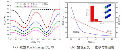 地表載荷對管道產生的附加力隨埋深增加而減小。不同埋深下管道應力應變響應如圖6所示,管道最大應力和高應力區(qū)隨埋深增加而減小,同時管道下半部分的應力也逐漸減小。當管道埋深為1 m時,其上半部分截面呈現(xiàn)了塑性變形。因而,淺埋管道在地表堆載作用下更容易發(fā)生失效。對于人類活動較為頻繁的區(qū)域,可增加管道埋深以降低其失效概率。