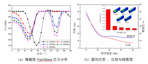 圖7(b)中,管道最大等效塑性應變隨著圍土彈性模量增加而減小。當E≥20 MPa時,管道塑性應變變化率非常小,且塑性應變分布較為接近。但當E=10 MPa時,管道卻出現(xiàn)了較為嚴重塑性區(qū),因而,在敷設管道回填時,需要嚴格關注回填土的選擇。埋地管道的沉降量和截面橢圓度均隨圍土彈性模量的增加而減小,但其變化率也逐漸減小。