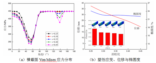 不同泊松比圍土中埋地管道的應力應變響應如圖8所示,管道應力分布基本相同。管道高應力區(qū)隨著圍土泊松比的增大而減小,但變化率較小。不同泊松比圍土中的管道塑性應變分布也基本相同,最大等效塑性應變均出現(xiàn)在管頂,但它隨著圍土泊松比的增大而減小,當泊松比大于0.3時,塑性應變的變化率較小。管道沉降量和截面橢圓度均隨著圍土泊松比的增大而減小,當泊松比大于0.3時,管道橢圓度變化較小。