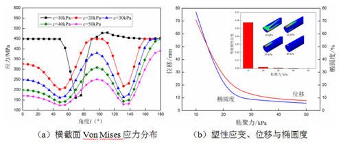 圖9(b)中,當c>30 kPa時,管道不會出現(xiàn)塑性變形。管道最大等效塑性應變和塑性變形區(qū)均隨圍土黏聚力的增大而減小。當c=40 kPa時,管道塑性變形區(qū)非常小。管道沉降量和截面橢圓度均隨圍土黏聚力的增大而減小。在管道發(fā)生屈曲以前(c ≥30 kPa),管道沉降量和截面橢圓度的變化率均非常小。因而,對于有埋地管道的砂土地層、粉土地層或其他黏聚力較小土體,必須嚴格控制地表載荷的大小,降低埋地管道的失效幾率。