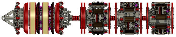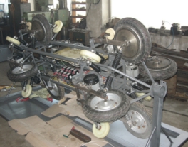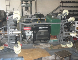 依托伊霍線等新建管道工程研制的自源主動運(yùn)動智能牽引系統(tǒng),成功解決了內(nèi)檢測器的動力源問題。該自源主動運(yùn)行智能牽引系統(tǒng)由輪式管道行走動力機(jī)械結(jié)構(gòu)和自動控制系統(tǒng)組成,其中輪式管道行走動力機(jī)械結(jié)構(gòu)由超輕車身、八輪行進(jìn)結(jié)構(gòu)、燃油系統(tǒng)支撐結(jié)構(gòu)、電機(jī)電瓶系統(tǒng)支撐結(jié)構(gòu)等組成,自動控制系統(tǒng)由汽油發(fā)電機(jī)控制系統(tǒng)、速度控制系統(tǒng)和供電監(jiān)測系統(tǒng)等組成。依托于該自源主動運(yùn)行智能牽引系統(tǒng),成功開展了牽引力試驗、爬坡能力試驗(下坡速度控制在1.2 m/s以下)、彎頭能力試驗和工作壽命試驗等,實現(xiàn)了我國首次空管變徑、弱磁內(nèi)檢測。