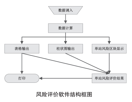 在基于模糊失效概率等級的站場風(fēng)險評價模型理論研究的基礎(chǔ)上研制了站場風(fēng)險評價軟件系統(tǒng),方便對各種信息參數(shù)的管理和綜合利用,提高了站場風(fēng)險評價的工作效率,充分識別站場的各項風(fēng)險。軟件的結(jié)構(gòu)模塊如下圖所示,“數(shù)據(jù)調(diào)入”用于完成數(shù)據(jù)的輸入!皵(shù)據(jù)計算”按輸氣站場風(fēng)險評價的計算法則完成各種參數(shù)的計算!氨砀褫敵觥笔菍⒂嬎闼玫慕Y(jié)果數(shù)據(jù)以數(shù)據(jù)表的方式顯示、排序!爸鶢顖D輸出”是以柱狀圖的方式顯示計算結(jié)果!肮に嚵鞒淌疽鈭D”是該軟件中特有的,以站場的區(qū)塊為背景,直觀、形象地顯示所評價的站場及站場上各個區(qū)塊的風(fēng)險狀況。“單個輸氣站場風(fēng)險評價結(jié)果”為該軟件的最后一個輸出模塊,它能夠詳細(xì)地顯示被評價站場的基本信息、風(fēng)險評價結(jié)果、威脅該站場的主要因素以及相應(yīng)的風(fēng)險緩解建議措施!按蛴 蹦軌?qū)崿F(xiàn)該軟件評價結(jié)果的預(yù)覽和輸出打印。