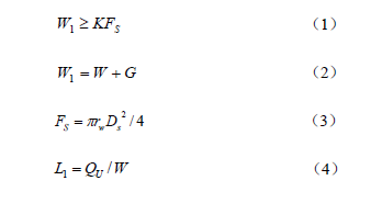 式中:W1為管道抗浮力,N/m;L1為由浮力控制安裝間距,m;Qu為每套螺旋地錨的設(shè)計拉力, N;G為單位長度管身自重,N/m;W為單位長度配重,N/m; Fs為單位長度管段靜水浮力,N/m; rw為所穿水域水的重度,N/ m3; Ds為管身結(jié)構(gòu)的外徑,m;K1為穩(wěn)定安全系數(shù),取1.2。