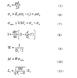式中σh為內(nèi)壓產(chǎn)生的環(huán)向應(yīng)力,MPa;σa為內(nèi)壓與溫度變化產(chǎn)生的軸向應(yīng)力,MPa;Es為鋼管彈性模量,取2.0×105,MPa;μ為鋼管泊桑比,取0.3;α為鋼管線膨脹系數(shù),取1.5×10-5,m/(m•℃); t1為管道安裝閉合時的環(huán)境溫度,℃;t2為管道輸送介質(zhì)的溫度,℃;σe為當(dāng)量應(yīng)力,MPa;σs為鋼管的最低屈服強(qiáng)度,MPa;M為鋼管均布荷載最大彎曲力距,N•m;W為鋼管截面系數(shù),m3;I為鋼管截面慣性矩;Ds為鋼管外徑,m;ds為鋼管內(nèi)徑,m。K2為穩(wěn)定安全系數(shù),建議取值范圍:1.2~1.5。