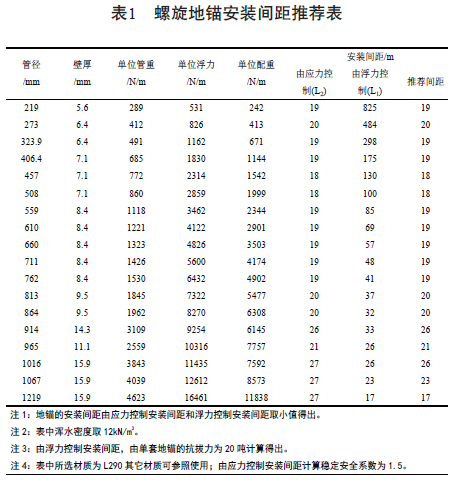 通過對不同的材質(zhì)、管徑及壁厚進(jìn)行計算可以得出,管徑較小時(<1016mm),安裝間距由應(yīng)力控制,管徑較大時(≥1016mm),安裝間距由浮力控制;材質(zhì)及壁厚對其影響不大。