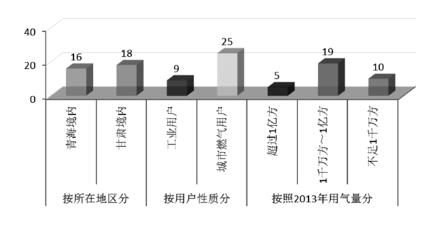 澀寧蘭管道沿線現(xiàn)有用戶34家,分輸口共計41處。按所在地區(qū)分:青海境內(nèi)16家,甘肅境內(nèi)18家。按用戶性質(zhì)分:工業(yè)用戶9家,城市燃?xì)庥脩?5家。按照2013年用氣量分:超過1億方的5 家,1千萬方~1億方的19家,不足1千萬方的10 家。