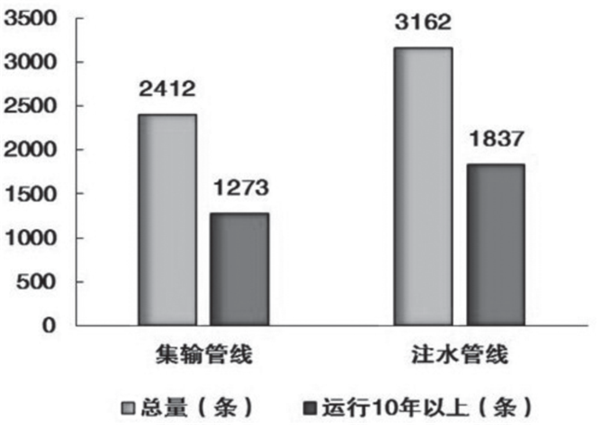 腐蝕泄漏問(wèn)題突出。至2015年6月,全廠范圍內(nèi)運(yùn)行10年以上的原油管道和注水管道分別占總量的53%和58.1%(如圖1所示),部分管道已經(jīng)呈現(xiàn)老化腐蝕現(xiàn)象。