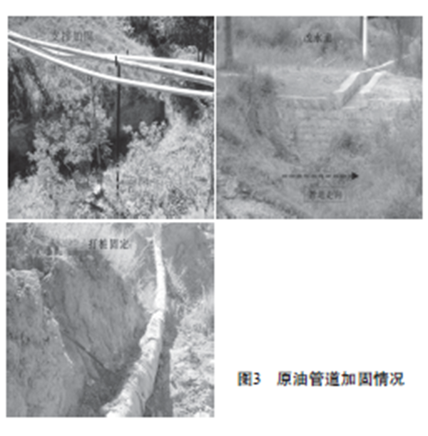對(duì)管道實(shí)施加固工程。懸空超過(guò)10米以上的管道,重新添加管線支撐48處;支墩下移已起不到支撐作用的,現(xiàn)場(chǎng)重新制作管道支墩26座;管道容易出現(xiàn)塌方的部位,改水道、修排水渠6處;已經(jīng)處于塌方地段的管道,無(wú)法改水渠和進(jìn)行加固時(shí),現(xiàn)場(chǎng)打樁用鋼絲繩進(jìn)行固定36處,盡可能使其不受山體塌方的影響(如圖3所示)。