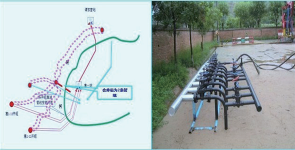 創(chuàng)新管道管理工藝。對(duì)位于安塞縣建華寺鎮(zhèn)的5處10條穿河管道進(jìn)行了重點(diǎn)治理。按照管道穿河治理原則,作業(yè)區(qū)對(duì)塞1-231等5個(gè)井組管線予以合并,將5條穿越河道的管道整合成1處,在塞1-231井組設(shè)立獨(dú)立的管道總機(jī)關(guān)進(jìn)行管理。通過(guò)實(shí)施合并管理工藝,將管道穿越河道的風(fēng)險(xiǎn)由以前的10條降低為2條,同時(shí)減少了10條老化管道。管線合并后,既不影響原油生產(chǎn),又消減了管道穿越河道的環(huán)保風(fēng)險(xiǎn)(如圖4所示)。