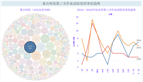 由于村/社區(qū)、鎮(zhèn)/街辦、區(qū)和市之間具有行政隸屬關(guān)系,我們可以利用該變量的分層鉆取功能,快速地在同一儀表盤中展現(xiàn)市、區(qū)、鎮(zhèn)/街辦等轄區(qū)內(nèi)的施工活動活躍程度,讓各區(qū)、各責任段的管道保護人員從中發(fā)現(xiàn)能指導自己工作的有價值的信息。從圖1可以看出,廣佛區(qū)的坑頭村、廟頭社區(qū)、里仁洞村、樟邊村、海傍村、金山村、鐘三村,東莞區(qū)的溫塘村,惠州區(qū)的黃漁涌村、南坑村內(nèi)近三年施工活動活躍度很高;而其中的坑頭村,2015年為近三年中活躍度最高的年份,盡管各年逐月變化的趨勢不盡相同,但每年的3月、4月及8月、9月份基本達到當年峰值,呈現(xiàn)出明顯的活躍期。圖1及圖2的可視化及分析結(jié)果,有助于管道安防人員通過增加相應時段的管道巡查頻率、加強管道保護宣傳和外事協(xié)調(diào)來預警和管控施工活動違規(guī)行為。