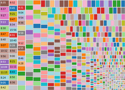 運用數(shù)據(jù)可視化軟件的“樹地圖”功能,在連接到數(shù)據(jù)源后,依次雙擊字段“記錄數(shù)”和“時間”,再單擊“智能顯示”下拉菜單選項中的“樹地圖”,然后將“時間”字段拖曳到標記“顏色”框中,即可實現(xiàn)第三方作業(yè)時間的可視化(如圖3)。圖中顏色深淺和方塊順序(自上而下,自左至右)分別表示同一作業(yè)時間所包含事件記錄的多少。