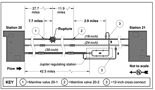 20#、21#壓氣站間共有3條管道,管道可以通過一條30英寸環(huán)線管道實(shí)現(xiàn)互通。事件發(fā)生時(shí), 30英寸管道正向100#管道注入天然氣。另外,破裂點(diǎn)上下游各有一個(gè)自動(dòng)關(guān)斷閥門,分別為20-1# 及20-2# 。