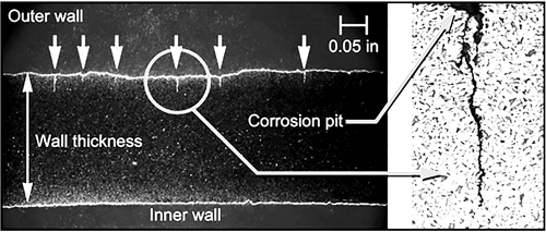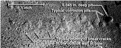 管體表面可以見到腐蝕坑,通過磁粉探傷可以觀察到管道外壁細(xì)小的線性裂紋。