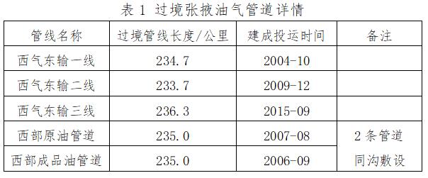 目前,經(jīng)過張掖的油氣管道共5 條,總長度1174.7公里,詳情見表1。