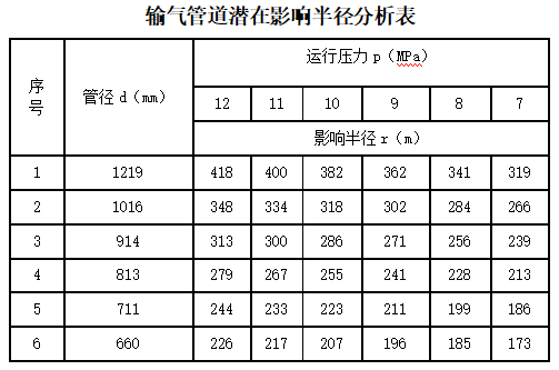 從上表數(shù)據(jù)可以看出,當(dāng)管徑為1219毫米,壓力為12MPa時(shí)(如西氣東輸二線等),其潛在影響半徑達(dá)到418米。