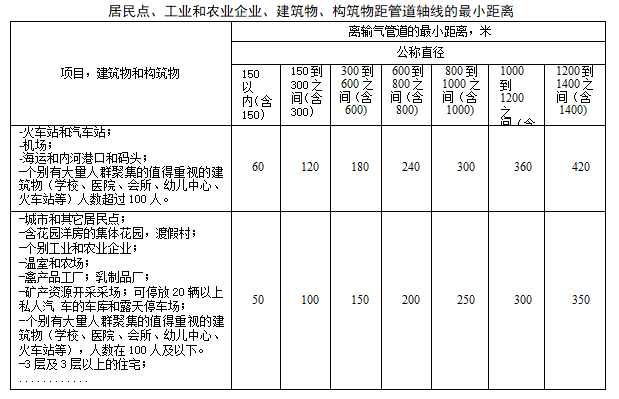 (2)俄羅斯聯(lián)邦《大型管道壓力大于10MPa時(shí)的設(shè)計(jì)標(biāo)準(zhǔn)》(ГОСТ Р55989-2014)相關(guān)規(guī)定。該標(biāo)準(zhǔn)規(guī)定了居民點(diǎn)、工業(yè)(農(nóng)業(yè))企業(yè)、建筑物、構(gòu)筑物距干線輸氣管道的最小距離(見下表)。其中屬于人口密集的火車站、汽車站、機(jī)場、學(xué)校、醫(yī)院、會(huì)所等(相當(dāng)于我國標(biāo)準(zhǔn)規(guī)定的4級(jí)地區(qū))距干線管道的距離,按照管道直徑150—1400毫米等7個(gè)檔次,規(guī)定最小距離為60米,最大距離為420米。城市和居民點(diǎn)、3層及3層以上住宅距干線管道的距離,按照管道直徑150—1400毫米等7個(gè)檔次,規(guī)定最小距離為50米,最大距離為350米。