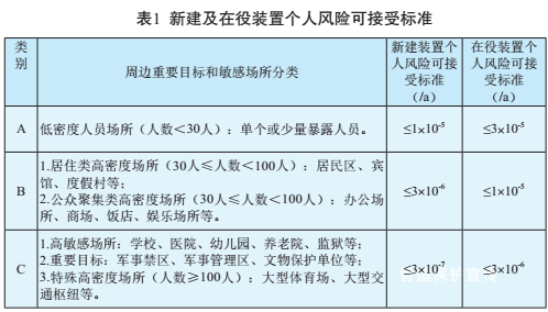國家安監(jiān)總局在對(duì)發(fā)達(dá)國家土地安全規(guī)劃、安全距離確定方法進(jìn)行廣泛調(diào)研和分析的基礎(chǔ)上,結(jié)合我國國情,于2014年4月22日出臺(tái)了《危險(xiǎn)化學(xué)品生產(chǎn)、儲(chǔ)存裝置個(gè)人可接受風(fēng)險(xiǎn)標(biāo)準(zhǔn)和社會(huì)可接受風(fēng)險(xiǎn)標(biāo)準(zhǔn)》 [9],見表1。此標(biāo)準(zhǔn)針對(duì)的是危化行業(yè),但由于管道輸送的介質(zhì)是石油、天然氣,屬于;,作者認(rèn)為可以參考使用。