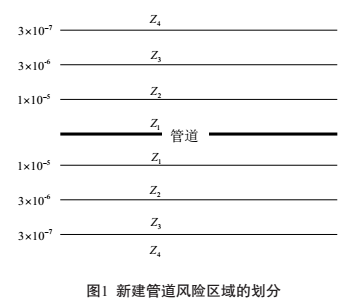 根據(jù)表1,可以將新建及在役管道劃分為四個(gè)風(fēng)險(xiǎn)區(qū)域Z1、Z2、Z3、Z4,如圖1所示。在圖1中Z1區(qū)域,新建管道的個(gè)人風(fēng)險(xiǎn)值IR≤1×10-5,在役管道的個(gè)人風(fēng)險(xiǎn)值IR≤3×10-5。區(qū)域內(nèi)人數(shù)應(yīng)<30人,如果超過,管道應(yīng)改線或者將建筑物搬離。