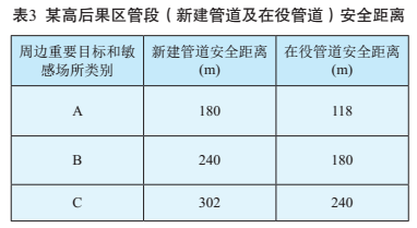 從上表可以看出,確定的安全距離值相比現(xiàn)有標(biāo)準(zhǔn)規(guī)范給定的值大很多。這主要是由于管道風(fēng)險(xiǎn)可接受標(biāo)準(zhǔn)參考;袠I(yè)確定,對(duì)管道行業(yè)來講,可能過于嚴(yán)格。此外,目前設(shè)定的管道中心線兩側(cè)各5m的距離,普遍認(rèn)為保證不了管道周邊的人員安全,其設(shè)定的初衷只是為了方便事故后的搶險(xiǎn)入場(chǎng)。國內(nèi)多處管道改線案例也證明了這一點(diǎn):在管道穿過市鎮(zhèn)的區(qū)段,管道兩側(cè)雖保證了5m的距離,但由于周邊人口太過密集,管道企業(yè)與民眾都覺得風(fēng)險(xiǎn)過高。最后管道企業(yè)進(jìn)行了改線,將管道遷出了該區(qū)域。