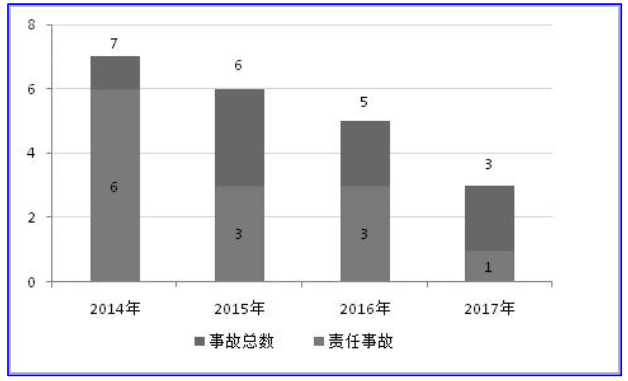 通過實施標準化站隊建設工作,2014年至2017年公司生產安全責任事故、較大影響生產安全事件發(fā)生起數(shù)逐年下降,分別見表1、圖1。