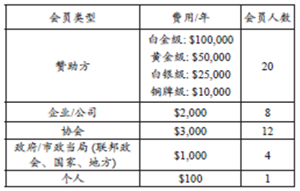 根據(jù)會員類型 ,每年會員的會費(fèi)及贊助類型由董事會來決定。會員等級和贊助包括以下內(nèi)容: