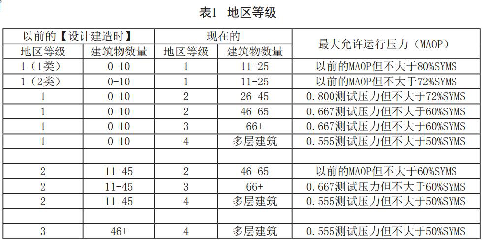 GB32167-2015《油氣輸送管道完整性管理規(guī)范》 6.3.4規(guī)定,地區(qū)發(fā)展規(guī)劃足以改變?cè)摰貐^(qū)現(xiàn)有等級(jí)時(shí),管道設(shè)計(jì)應(yīng)根據(jù)地區(qū)發(fā)展規(guī)劃劃分地區(qū)等級(jí)。對(duì)處于因人口密度增加或地區(qū)發(fā)展導(dǎo)致地區(qū)等級(jí)變化的輸氣管段,應(yīng)評(píng)價(jià)該管段并采取相應(yīng)措施,滿足變化后的更高等級(jí)區(qū)域管理要求。當(dāng)評(píng)價(jià)表明該變化區(qū)域內(nèi)的管道能夠滿足地區(qū)等級(jí)的變化時(shí),最大操作壓力不需要變化;當(dāng)評(píng)價(jià)表明該變化區(qū)域內(nèi)的管道不能滿足地區(qū)等級(jí)的變化時(shí),應(yīng)立即換管或調(diào)整該管段最大操作壓力。具體采取措施和評(píng)價(jià)方法需要另行制定行業(yè)或企業(yè)標(biāo)準(zhǔn)。