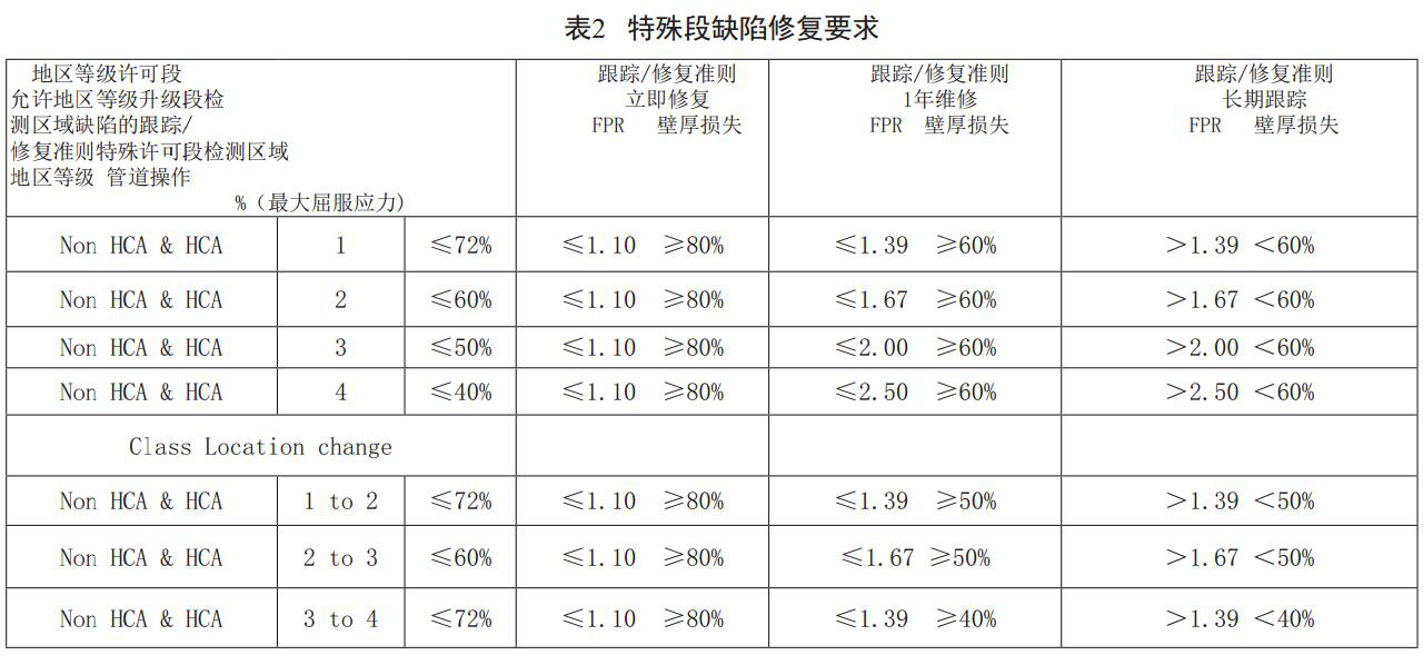 PHMSA要求運(yùn)行商按表2修復(fù)特殊段的缺陷 , 同 時(shí) 特 殊 地 段 之 外 的 管 段 要 符 合 4 9 C F R192.111管道設(shè)計(jì)系數(shù)要求。