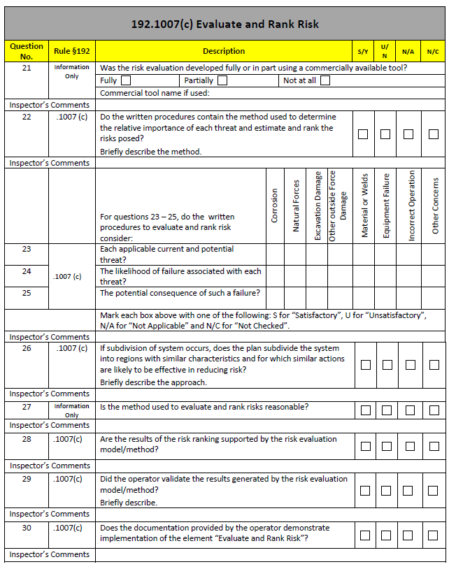 由PHMSA于2011年9月制定和發(fā)布。用于檢查和評價燃氣運營企業(yè)開展完整性管理情況,檢查手冊(示例見圖5)以表格和提問形式進行檢查。對于問題的回答有S/Y、U/N和N/A三種形式,其中S/Y表示是或者滿足條件,U/N表示不是或者不滿足條件,N/A表示標準不適用或者未進行檢查。燃氣企業(yè)也可利用該檢查手冊進行自檢,以完善其完整性管理水平。