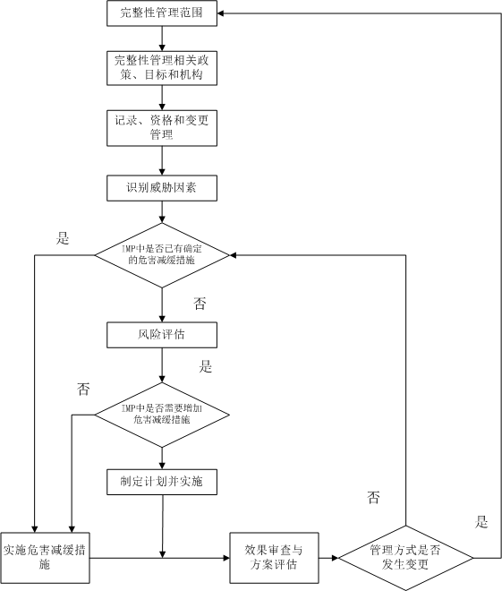 燃氣運營企業(yè)制定和實施的完整性管理方案應(yīng)當(dāng)包含七個要素:基礎(chǔ)信息、識別威脅因素、風(fēng)險評價與分級、制定和實施風(fēng)險減緩措施、效能評價與成效評估、階段性評估與改進、結(jié)果匯報。美國燃氣管理機構(gòu)制定的其他標準、規(guī)范和指南都是按照這七個方面展開。完整性管理基本流程見圖3。