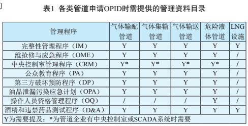 2012年3月21日,美國(guó)交通運(yùn)輸部管道和危險(xiǎn)材料安全管理局(Pipeline and Hazardous MaterialsSafety Administration ,PHMSA)頒布了一份聯(lián)邦公告,并對(duì)聯(lián)邦法典49 CFR 191.22 和195.64兩個(gè)章節(jié)進(jìn)行修訂,要求所有油氣管道運(yùn)營(yíng)商應(yīng)取得PHMSA頒發(fā)的運(yùn)營(yíng)商注冊(cè)號(hào)(Operator IdentificationNumber, OPID)。PHMSA建立了國(guó)家管道注冊(cè)管理信息系統(tǒng),供管道運(yùn)營(yíng)商在線提交OPID申請(qǐng)書(shū)。申請(qǐng)書(shū)及相關(guān)材料經(jīng)PHMSA審核合格后,由PHMSA核準(zhǔn)頒發(fā)OPID編號(hào)[2~3]。在OPID申請(qǐng)書(shū)中,管道運(yùn)營(yíng)商需要填寫(xiě)管道基本信息、相關(guān)安全管理人員聯(lián)系方式,并提供相關(guān)管道安全管理制度。在管道基本信息中要詳細(xì)描述管道類型、介質(zhì)類型、州際管道/州內(nèi)管道、途經(jīng)州/縣名稱及各州縣管道長(zhǎng)度。各類管道申請(qǐng)OPID時(shí)需要提供的管理制度資料目錄見(jiàn)表1。管道運(yùn)營(yíng)商在獲得OPID后,如果企業(yè)的安全管理程序發(fā)生變更,需要重新提交PHMSA備案[2~3]。