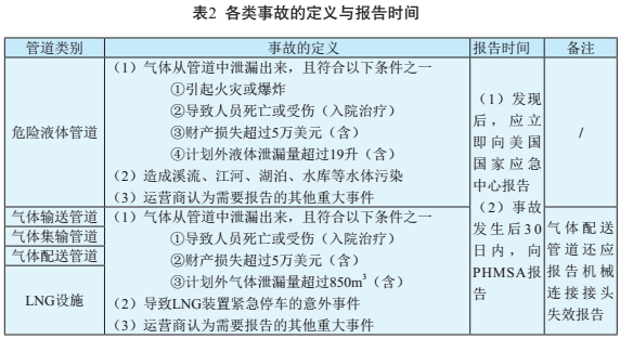 從上世紀(jì)80年代開(kāi)始,美國(guó)就將管道事故報(bào)告制度納入法規(guī)要求。目前,對(duì)危險(xiǎn)液體管道、氣體輸送管道、氣體集輸管道、氣體配送管道和LNG設(shè)施,均要求填報(bào)事故報(bào)告,事故的報(bào)告范圍和報(bào)告時(shí)間見(jiàn)表2[2~3]。PHMSA對(duì)各類管道分別制定了專門(mén)的數(shù)據(jù)報(bào)送表格,信息內(nèi)容極為詳盡,但填報(bào)方式非常簡(jiǎn)單,多以選擇或填空的方式填寫(xiě),以便于信息的數(shù)據(jù)化處理。事故報(bào)告的主要內(nèi)容包括事故基本情況、事故后果、事故位置、事故管道的基本屬性、事故詳細(xì)的原因分析等內(nèi)容。PHMSA允許運(yùn)營(yíng)商多次報(bào)送補(bǔ)充信息,以確保事故信息的準(zhǔn)確性和完整性。