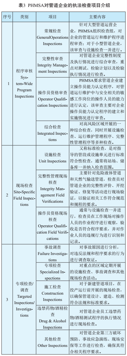 PHMSA對(duì)管道運(yùn)營(yíng)企業(yè)的執(zhí)法檢查分為:程序?qū)徍恕F(xiàn)場(chǎng)檢查和專項(xiàng)檢查/調(diào)查等3類,各類執(zhí)法檢查的項(xiàng)目和主要內(nèi)容見(jiàn)表3[7]。