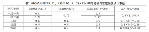 劃分地區(qū)等級的目的是區(qū)分管道強度設(shè)計系數(shù),管道強度設(shè)計系數(shù)與地區(qū)等級配套使用,最早用于輸氣管道設(shè)計,后來也被高蒸汽壓液體管道所采用。GB50251-2015規(guī)定的強度設(shè)計系數(shù)主要參考了ASME B31.8,增加了一級一類地區(qū)和一級二類地區(qū),引入了0.8的設(shè)計系數(shù)。但值得注意的是,美國聯(lián)邦法規(guī) 49CFR 192至今未采納0.8的強度設(shè)計系數(shù),允許的最大強度設(shè)計系數(shù)為0.72。 CSA Z662規(guī)定計算管道設(shè)計壓力的設(shè)計系數(shù)為F×L,設(shè)計系數(shù)( F)取值為0.8, L為地區(qū)等級系數(shù),對于非酸性天然氣管道,地區(qū)等級系數(shù)( L)取值為:一級地區(qū)為1、二級地區(qū)為0.9、三級地區(qū)為0.7、四級地區(qū)為0.55。一般地段的輸氣管道的設(shè)計系數(shù)規(guī)定匯總見表2。由表2看出, CSA Z662的設(shè)計系數(shù)明顯高于其他標(biāo)準(zhǔn)。