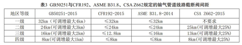 輸氣管道設(shè)置線路截斷閥的目的是便于管道維護修理以及當(dāng)管道發(fā)生破損時,盡可能減少損失和防止事故擴大。對比GB50251-2015與CFR192、ASME B31.8、 CSA Z662發(fā)現(xiàn),我國與北美對輸氣管道線路截斷閥最大間距的要求基本相同,但需要指出的是, GB50251-2015參考CSA Z662規(guī)定允許按照地區(qū)等級對線路截斷閥間距進(jìn)行調(diào)增。線路截斷閥最大間距規(guī)定匯總對比見表3。 49CFR 192對輸氣管道截斷閥間距要求較為嚴(yán)格。