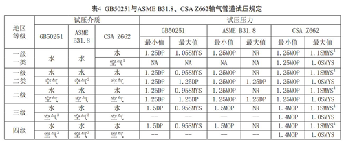 GB50251-2015允許的最大試壓壓力低于ASME B31.8的規(guī)定; ASME B31.8對于水作為試壓介質(zhì)時,未規(guī)定最大試壓壓力。試壓介質(zhì)上, CSA Z662對于任何管段均許可采用氣體試壓,其8.7.2.3條規(guī)定了適用條件:當(dāng)管材符合加拿大國家標(biāo)準(zhǔn)關(guān)于切口韌性要求、是新管道且焊縫系數(shù)為1、試壓時符合一定條件,才允許采用空氣或不可燃、無危害氣體作試壓介質(zhì)。這些條件包括環(huán)境溫度過低、符合水質(zhì)的水量不夠、排水不便、管段沿線地形起伏引起水試壓分段過多、不允許管段任何點強度試壓產(chǎn)生的環(huán)向應(yīng)力超過最低屈服強度的80%等(見表4)。