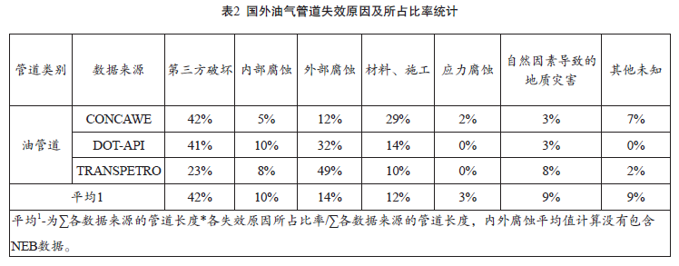 造成輸油管道事故的原因主要有第三方破壞、腐蝕、材料和施工、管道應(yīng)力腐蝕、自然原因造成的地質(zhì)災(zāi)害和其他未知因素。根據(jù)國外統(tǒng)計數(shù)據(jù),輸油管道平均失效頻次約為0.46×10-4 次/(km•),根據(jù)管道的失效原因和失效頻次,對不同數(shù)據(jù)來源的管道失效原因所占頻次進(jìn)行統(tǒng)計, 顯見第三方破壞和管道內(nèi)外腐蝕為主要因素。