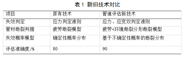 相繼完善了管道氫致開裂、焊縫、平面型缺陷、體積型缺陷、管道不同損傷狀況的評估理論。研究了在線、離線管道評估技術,提出了氫致開裂斷裂判據(jù),建立了含H2S管道安全評價模型和失效評定圖,解決了管道完整性評估理論與生產實踐脫節(jié)的問題[5]。并首次建立了基于應力和應變雙重判據(jù)的管道失效評估方法,發(fā)現(xiàn)并揭示了管材氫致開裂韌脆硬化分形擴展機理,重構了失效模型和評定圖;基于應力-強度干涉理論[6],建立了不確定性條件下管道的失效概率模型。新理論和新方法評估準確度提高10%,詳見表1。