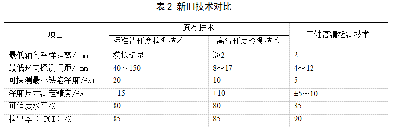 中國管道檢測公司、沈陽工業(yè)大學、中國石油大學(北京)等聯(lián)合研發(fā)三軸高清漏磁內檢測、全向勵磁漏磁檢測技術及系列裝置,發(fā)明了多通道高精度變形檢測裝置和管道應變監(jiān)測系統(tǒng)。該系列裝置傳感器(圖2采用XYZ三維立體分布代替?zhèn)鹘y(tǒng)單軸分布,開發(fā)新型集成固化耦合傳感器和全數(shù)字化三維漏磁信號采集系統(tǒng)。使國內檢測技術指標值大幅提升,檢測缺陷深度門檻值壁厚由20%提高到5%(國際檢測指標),檢出率(POI)提高5%,達到90%[8-9],詳見表2。