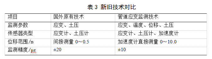 多通道高精度變形檢測裝置和管道應變監(jiān)測系統(tǒng),采用高精度角位移傳感器、抗抖探頭擺動裝置和拓撲算法代替原有直位移傳感器和模擬算法,提高了定位精度;采用振弦式高精度抗干擾傳感器,實時精準監(jiān)測高風險點管道應變,采集精度指標達到±10με(微應變),實現(xiàn)了管道應變數(shù)據(jù)采集策略的自動控制及遠程維護(表3)。