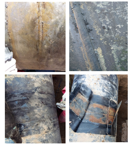 如分公司管轄某輸氣管道存在多處補(bǔ)口帶下缺陷。2016年分公司對該管段80處補(bǔ)口帶下缺陷進(jìn)行了開挖修復(fù),其中50處補(bǔ)口存在不同程度的空鼓,管道表面存在施工期留下的焊渣、浮土或浮銹;21處補(bǔ)口完好,但焊縫存在輕微缺陷;僅9處補(bǔ)口及焊縫均完好(圖1)。又如某輸油管道內(nèi)檢測時發(fā)現(xiàn)多處凹陷。2012年對該管段23處凹陷進(jìn)行開挖驗證及修復(fù),發(fā)現(xiàn)22處凹陷均位于管道底部,都由于在施工過程中管道下方的回填細(xì)土層厚度不夠,導(dǎo)致管線直接和石頭接觸而出現(xiàn)變形。同時發(fā)現(xiàn)因施工中機(jī)械損傷的防腐層,部分甚至可以目測看到管道金屬。只有1處凹陷的施工質(zhì)量比較好,能按要求回填細(xì)土且在管線上方鋪設(shè)警戒帶(圖2)。