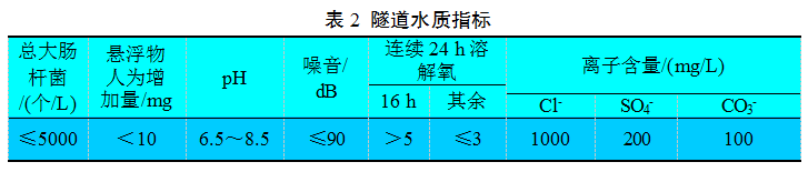 隧道水質(zhì)檢測指標(biāo)見表2。其中,懸浮物質(zhì)沉積于底部后不得對魚、蝦、貝類產(chǎn)生有害的影響,生化需氧量(COD)小于5 mg/L,5天化學(xué)需氧量(BOD)不超過2 mg/L。