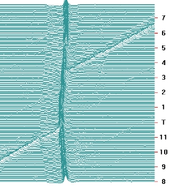目前,國內(nèi)大口徑長輸管道干線基本采用螺旋焊縫埋弧焊管道,經(jīng)內(nèi)檢測后可以清晰地看到螺旋焊縫和環(huán)焊縫信號(圖1)。內(nèi)檢測缺陷定位時,通常先開挖參考環(huán)焊縫(也就是距離缺陷點最近的上游或者下游的環(huán)焊縫),通過螺旋焊縫與環(huán)焊縫的交角來判定開挖的參考環(huán)焊縫是否準(zhǔn)確,缺陷定位開挖較方便。