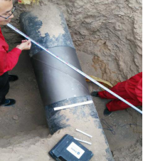 實際工作中,先找出內(nèi)檢測缺陷位置上下游最近的可識別特征,再用幾何測量微積分法確定參考環(huán)焊縫位置及內(nèi)檢測缺陷位置。某內(nèi)檢測缺陷開挖定位現(xiàn)場作業(yè)如圖5和圖6所示。