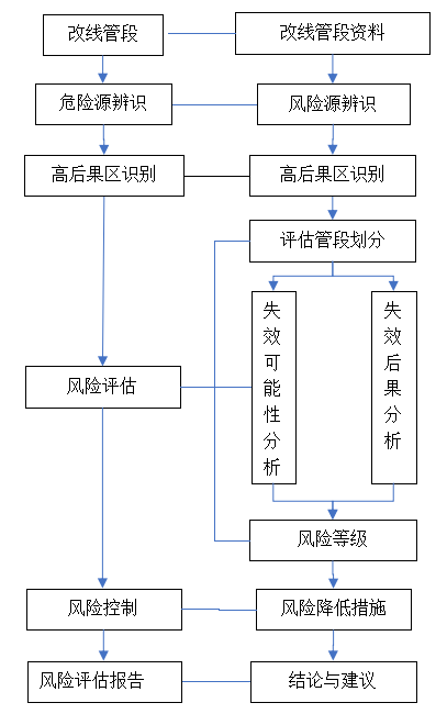 油氣管道在改線實施前,對改線管段會進行方案初步設(shè)計。改線管段的的風(fēng)險評估即可行性論證階段的埋地鋼質(zhì)管道的風(fēng)險評估。風(fēng)險評估流程如圖1所示。