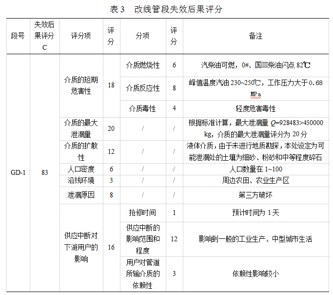 根據(jù)前文提出的改線管段風(fēng)險評估方法,改線管段GD-1的失效后果評分如表3所示。