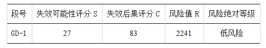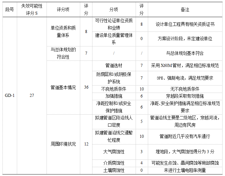 根據(jù)前文提出的改線管段風(fēng)險評估方法,改線管段GD-1的失效可能性評分如表2所示。