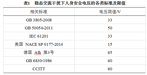 穩(wěn)態(tài)交流干擾危害,各國(guó)標(biāo)準(zhǔn)中人身安全電壓的限值見表 1 [6] 。其中美國(guó)NACE標(biāo)準(zhǔn)考慮比較全面,而且一般情況下15 V的穩(wěn)態(tài)安全電壓容易緩解達(dá)到,因此推薦使用。特殊情況下,可設(shè)置防觸碰裝置或均壓墊等措施進(jìn)行重點(diǎn)防護(hù)。
